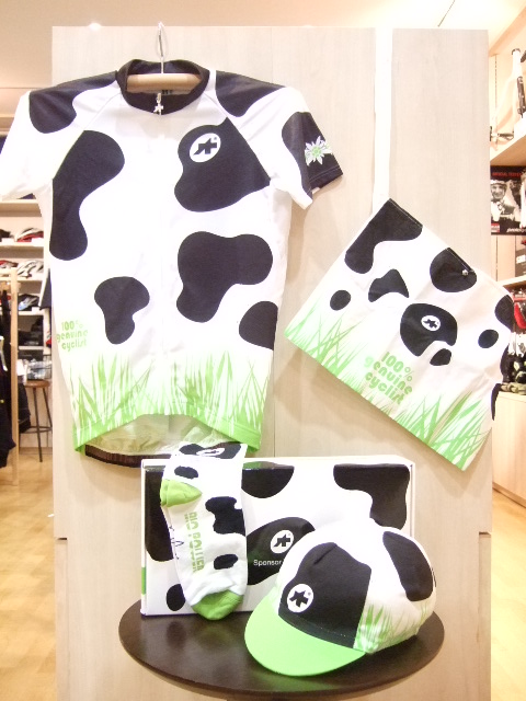 かわいい牛柄の箱の中に、ジャージ・キャップ・ソックス・サコッシュの4点が入っています。