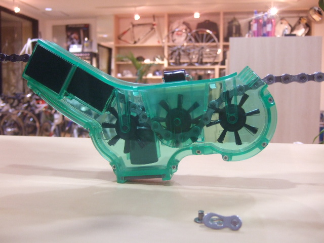 緑色の道具は、道具内に洗浄液を入れ、写真のようにせっとして後はペダルを逆回転に回すだけで隙間の汚れも含めどんどん落ちていきます。