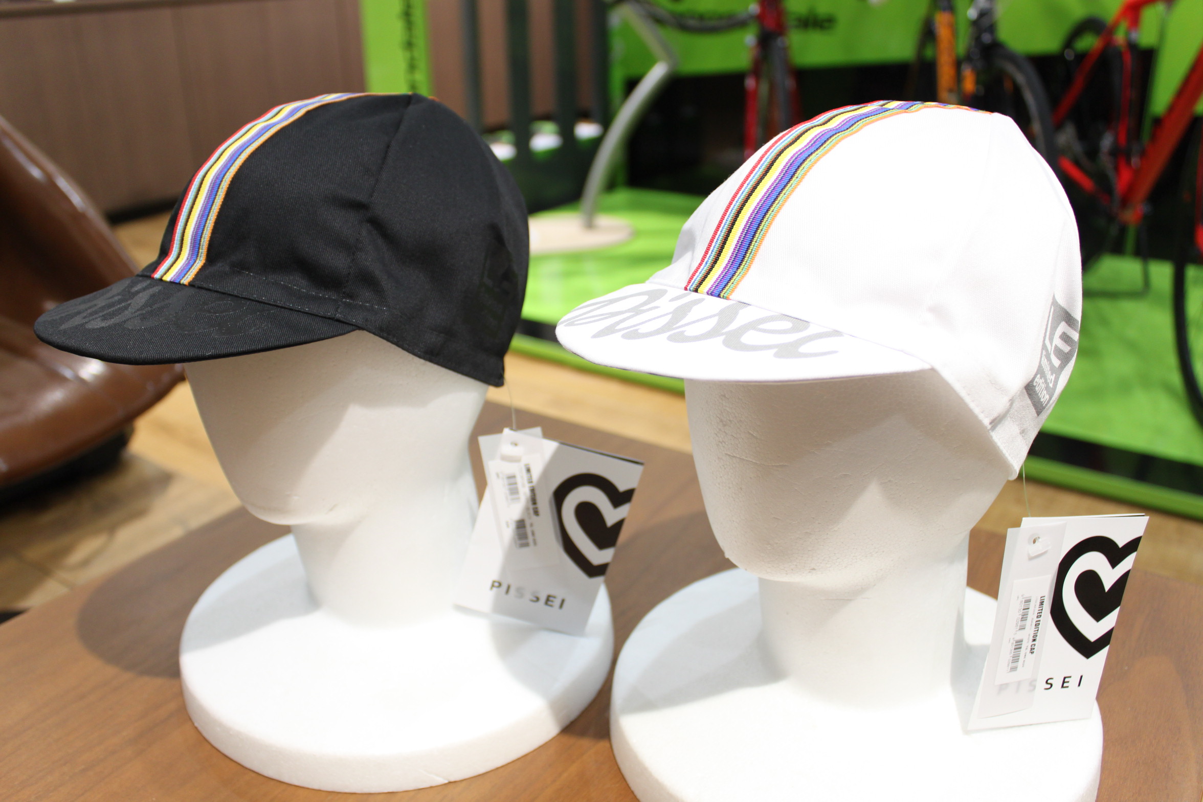サイクルキャップが入荷し展示できました。高品質でデザイン性にも優れる